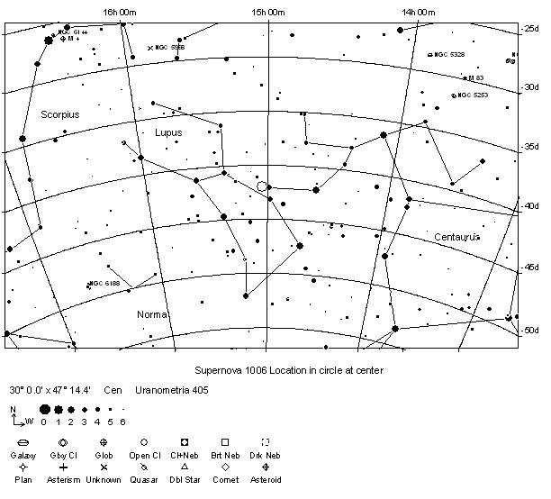 European accounts: Hepidannus of St. Gall, Switzerland wrote , “ The star was visible in the extreme south.” This places a limit on how far south it must have been since it must have been above the horizon from St. Gall (latitude 47 ½ degrees north). Chinese and Japanese accounts place the new star on the present day border of the Constellations Lupus and Centaurus, thus its position can be tied down to fine limits.