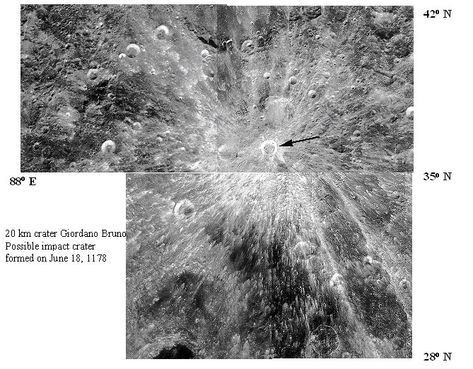 Using Clementine orbiter photography (from the National Space Science Data Center CD-ROM), there is an impressive 20-km-diameter crater at a latitude of 36° North and longitude of 103° East with a very prominent bright rays extending for hundreds of kilometers. Therefore Hartung concluded that this crater is the one formed on June 18, 1178. The crater, known as Giordano Bruno, is shown in Figure 1 below. The impact area on the Moon is shown as Figure 2.