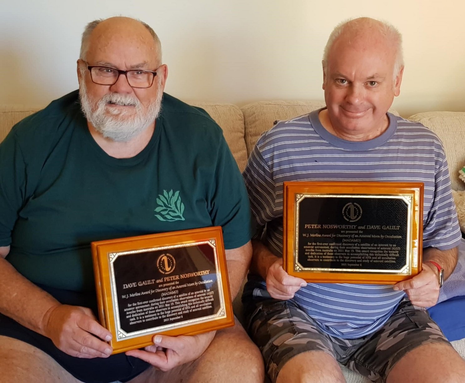 ....Homer F. Daboll Award winner: Ted Blank ................David E. Laird Award recipient: John D. Phelps ..................Dave Gault and Peter Nosworthy, MADAMO award recipients for the ...............................................................................................................................................................................................first ever discovery of an asteroid satellite by occultation - 4337 Arecibo